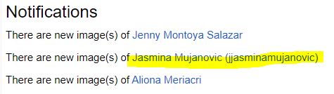For some reason the issue seems to be the alias in the brackets. There are some that seem to work, others which do not. If you hit the link from your notifications, then delete the bracketed alias in the search window, and hit search, you should be taken to that girl's images.
